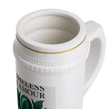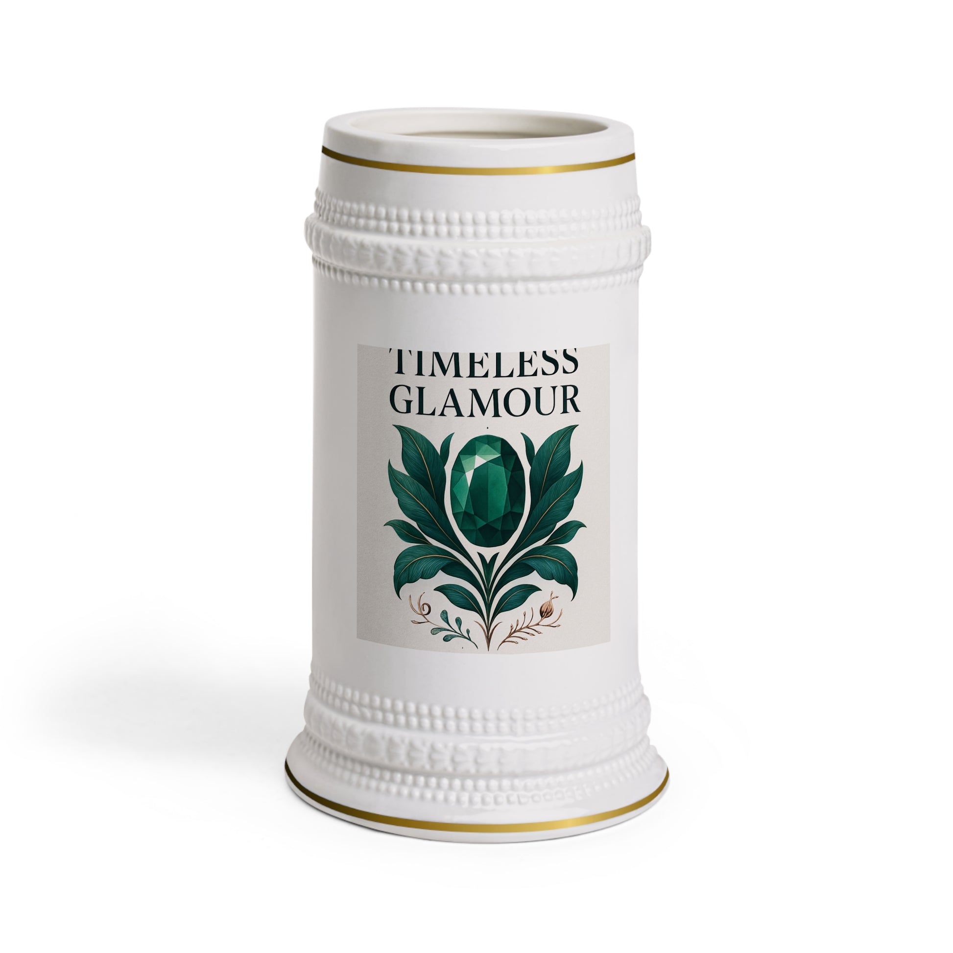 This 22oz ceramic stein brings old-world charm into lively, modern moments. Smooth white ceramic is trimmed with subtle gold accents on the rim and base, while raised beading around the body gives it a handcrafted, heirloom feel. A jewel-toned botanical design and the words "TIMELESS GLAMOUR" add a touch of vintage elegance—perfect for lingering conversations, celebratory toasts, or a quiet evening with a favorite brew. The large handle offers steady, comfortable grip so the stein feels substantial in hand. Durable ORCA coating preserves vivid color and a glossy finish through regular dishwasher cycles (do not microwave).